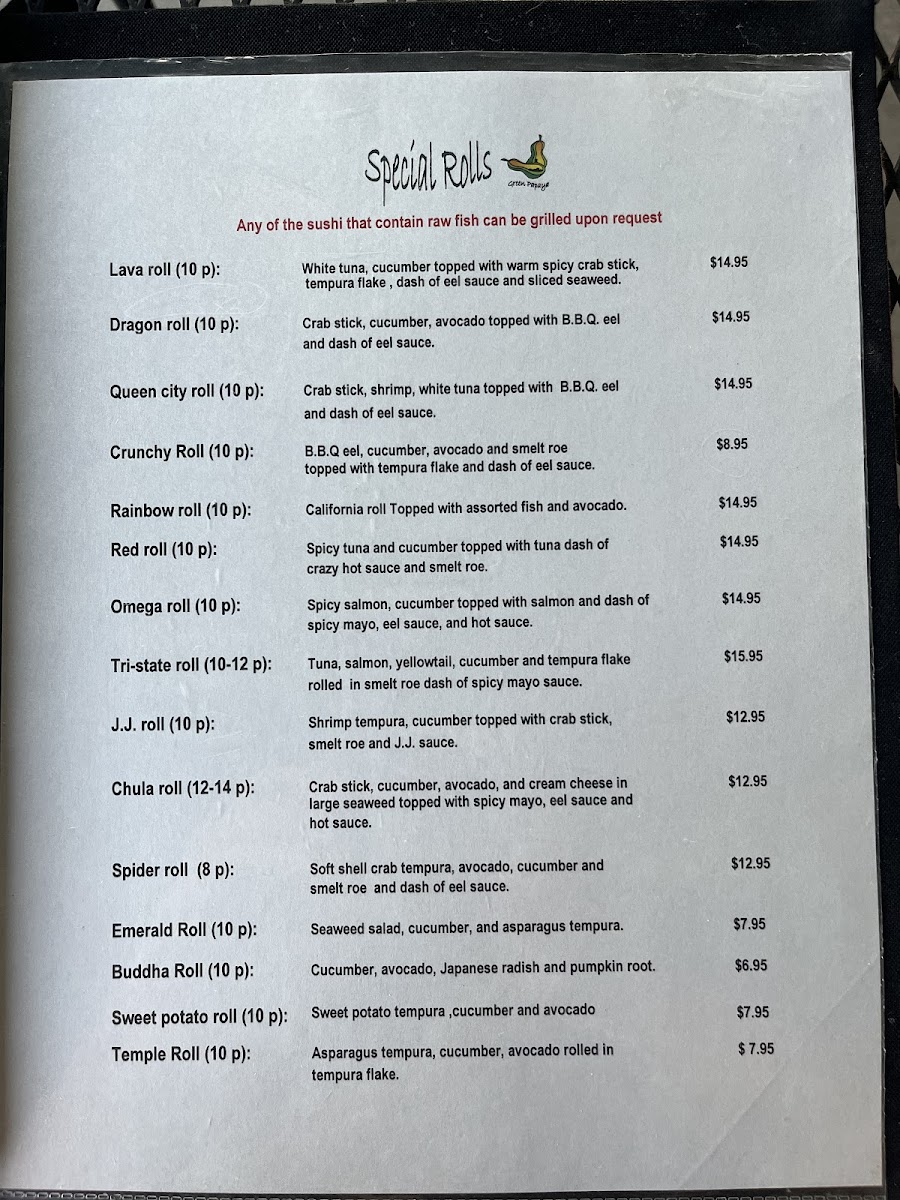 6 pieces of sushi, 5 pieces of sashimi, California roll or spicy tuna roll.